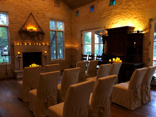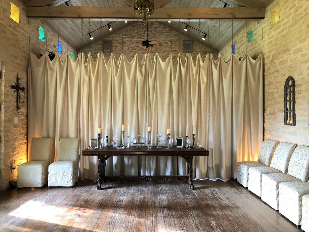 After your nuptials, toast to the beginning of your new life at our beautiful old world "monk's table" pre-set with everything you need for sharing cake and toasting with your favorite bubbly beverage.