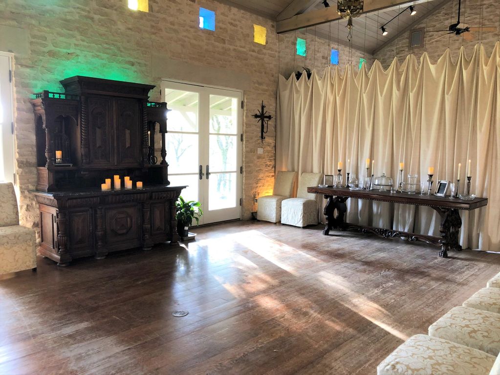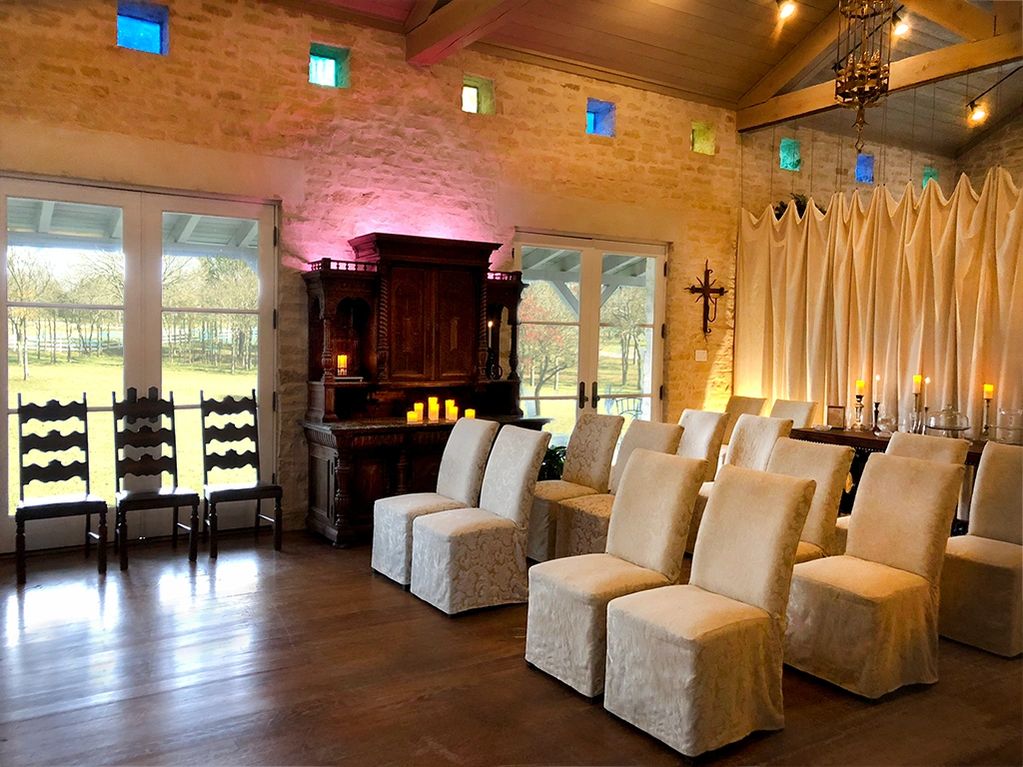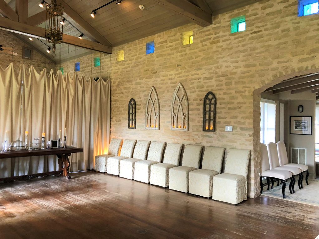 For Micro-Weddings, or our Walk-in & Wed events that include a reception at The Stone House Chapel, the chairs can be quickly moved up against the walls to make space for guests to sit and eat cake, make a toast, mingle, or even for your first dance!